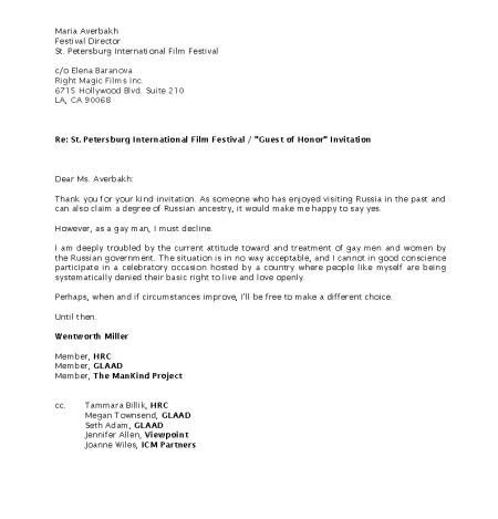 “作为一名同性恋人士,我不得不拒绝(出席圣彼得堡国际电影节),”米勒在信中这样写道,“俄罗斯当局对待同性恋的态度和政策都让我深感困扰。我无法接受这种现状。当像我这样的人在俄罗斯不被接受、无法拥有自由生活和恋爱的基本权利时,我实在无法违背自己的良心去出席如此盛会。”