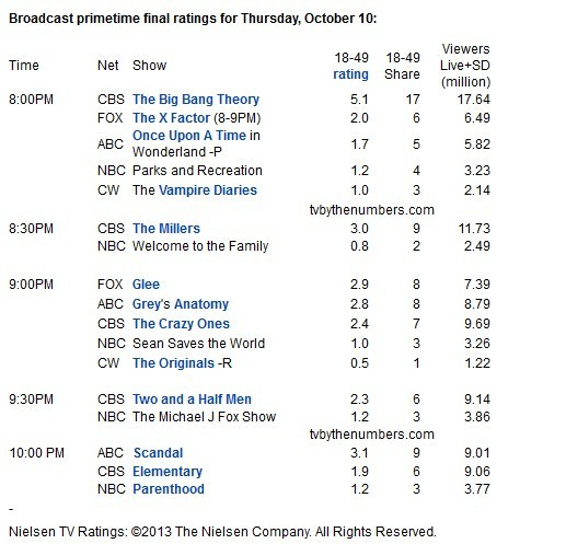 CBS方面,《生活大爆炸》(The Big Bang Theory 1720万/4.9)关键年龄段初步收视下滑6%;《米勒一家》(The Millers 1190万/3.1)成功留住《生活大爆炸》的观众,收视仅微降0.2;《疯狂广告人》(The Crazy Ones 1000万/2.4)大跌16%;《好汉两个半》(Two and a Half Men 900万/2.3)则来到历史最低;《福尔摩斯:演绎法》(Elementary 900万/1.9)重复本剧最差成绩。