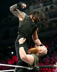 超级运动员保加利亚猛兽亚历山大对阵明显瘦小的辛卡拉貌似是强弱不等的一场比赛。 辛卡拉一开始利用自己的灵活性不断攻击亚历山大。但是貌似效果不是很明显。阿历山大抱起辛卡拉后连续几个膝盖撞击,接着一个Fallaway Slam(后仰摔)给了他。辛卡拉吃了亚历山大几次攻击后,开始使出自己的高空技能反击。辛卡拉站上边角一个飞踹把亚历山大踹倒。亚历山大回来把辛卡拉撞倒,使出强力的Side Slam!接着用终极锁技Camel Clutch把辛卡拉双手锁住,辛卡拉屈服。 Winner:Alexander Rusev 第八场比赛塞纳登场,APP票选结果是塞纳对阵整个怀亚特家族3人。 [b]三对一强弱不等赛 John Cenavs. Wyatt Family(Bray Wyatt, Erick Rowan& Luke Harper)[/b]