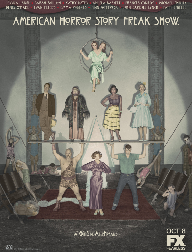 FX电视台于近期公布了即将回归的《美国恐怖故事》(American Horror Story)第四季“畸形秀( Freak Show)”的最新海报。在海报中,粉丝们可以看到各式各样的人物角色,比如由麦克·切克里斯(Michael Chiklis)饰演的大力士、莎拉·保罗森(Sarah Paulson)饰演的双头女、凯西·贝茨(Kathy Bates)所饰的长须妇人等。海报的主旨便是“我们都是畸形人(Wir sind alle freaks 德语版)”。