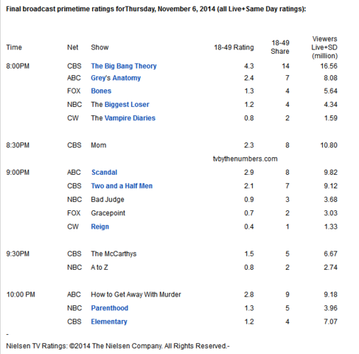 NBC:《超级减肥王》(The Biggest Loser 440万/1.2)微降0.1;《坏法官》(Bad Judge 370万/0.9)持平;《恋爱手册》(A to Z 270万/0.8)升0.1;《为人父母》(Parenthood 400万/1.3)连涨0.2,首次超过CBS剧集《福尔摩斯:演绎法》(Elementary)。