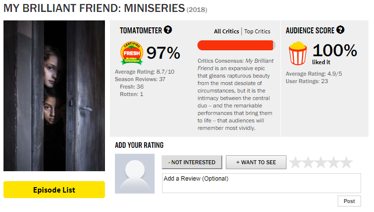 由HBO、RAI和TIMvision联合制作的8集电视剧《我的天才女友》11月19日首播,该剧改编于意大利作家埃莱娜·费兰特“那不勒斯四部曲”的第一部,曾在豆瓣畅销小说榜连续一周热度第一。埃莱娜·费兰特只是一个笔名,是意大利最受欢迎也最神秘的作家,其真实身份至今是谜,被评为2016《时代》周刊“世界最有影响力的100人”。《我的天才女友》由萨维里奥·康斯坦佐导演,《年轻的教宗》制作人亲自出马,豆瓣评分8.9分,烂番茄新鲜度97%,口碑还不错。