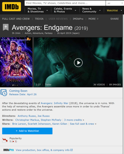 关于《复仇者联盟4:终局之战》的时长,此前一直传得沸沸扬扬,大家纷纷猜测,坊间一直流传说有182分钟,罗素兄弟接受采访时也表示影片时长不短于3小时。今日,据多家外媒的消息,《复仇者联盟4》真的是182分钟,是该系列时间最长的一集,IMDb和AMC、烂番茄等网站上已经公布了。